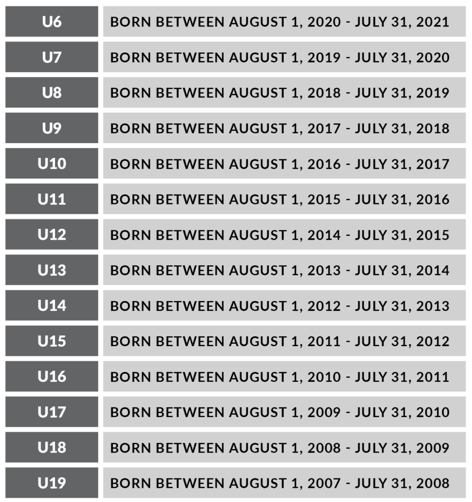 When determining your childs age group for a season, the year the season ends should be used for determining the players birth year. Also, note that the format “age followed by U” means that age and younger. For example, 8U means 8 and younger. For more age-group information please reference U.S. Soccer’s Player Development Initiatives.